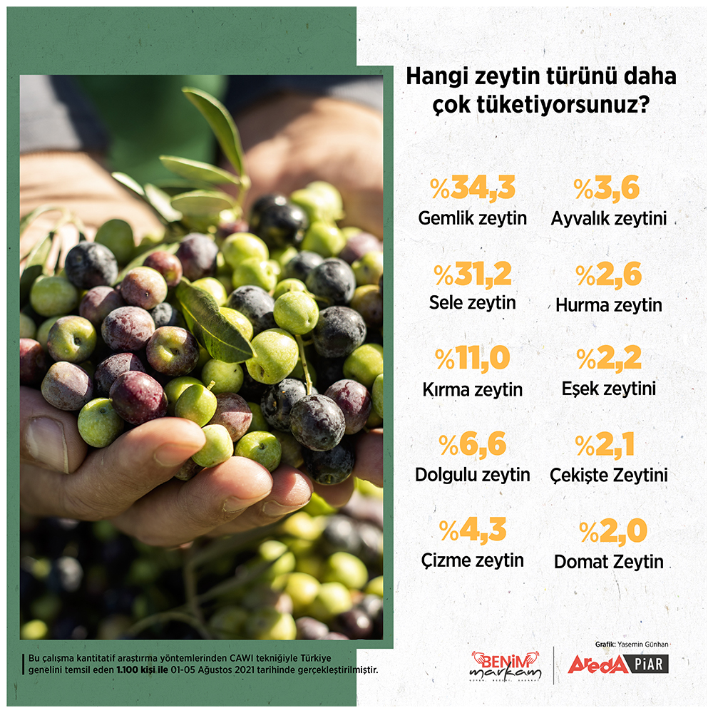 Araştırmada yer alan, “Hangi zeytin türünü daha çok tüketiyorsunuz” sorusuna katılımcıların yüzde 34.3’ü Gemlik zeytini, yüzde 31.2’si ise Sele zeytin cevabını verdi. İlgili soruya verilen diğer cevaplar şöyle: “kırma zeytin yüzde 11, dolgulu zeytin yüzde 6.6, çizme zeytin yüzde 4.3,ayvalık zeytini yüzde3.6, hurma zeytin yüzde 2.6, eşek zeytini yüzde 2.2, çekişte zeytini yüzde 2.1, domat zeytin yüzde 2”