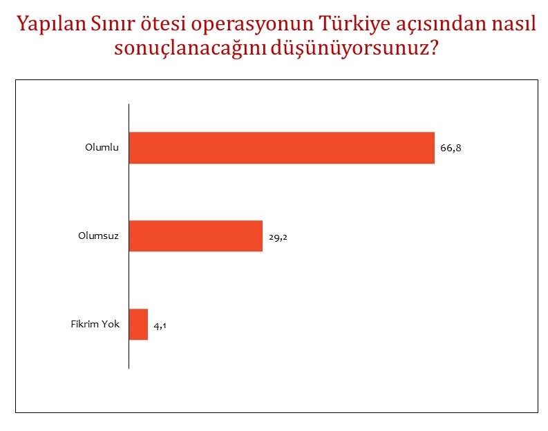 Araştırmaya katılanların %66,8’i yapılan ve yapılması gündemde olan olası sınır ötesi operasyonların olumlu sonuçlanacağı kanaatine sahiptirler. Vatandaşların % 29,2’si ise operasyonların sonuçlarının olumsuz olacağı görüşündedirler. Sınır ötesi operasyonların ülkenin iç güvenliğini sürdürülmesi ve olası saldırıların önlenmesi açısından önem arz ettiğini ifade edenlerin oranı %68,8’dir. Sınır ötesi operasyonların ülkemizin iç güvenliğine olumlu bir katkı da bulunmayacağını ifade edenlerin oranı ise %27,4’tür.